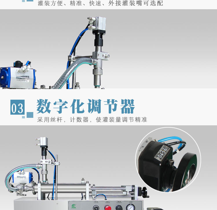 3、采用絲桿、計(jì)數(shù)器,使灌裝量調(diào)節(jié)精準(zhǔn),并可以數(shù)字形式直觀地體現(xiàn);