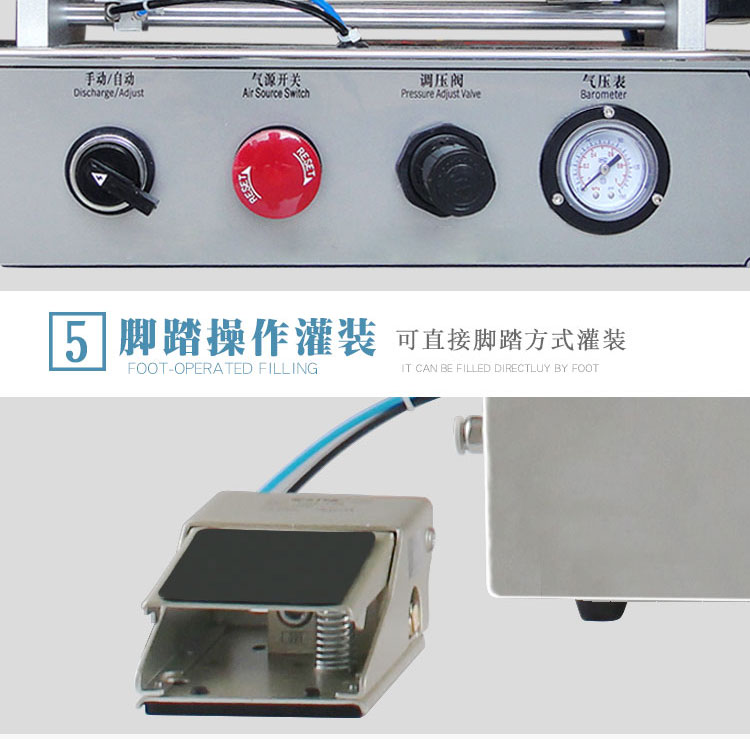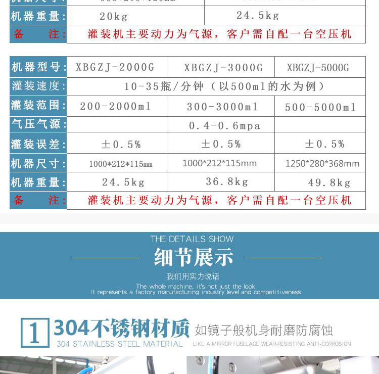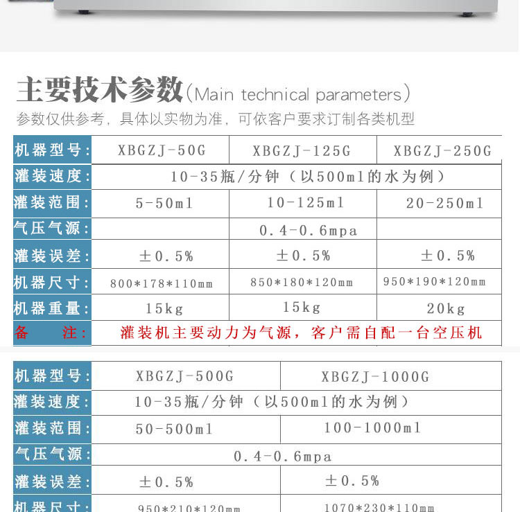 注:本機可選擇定做灌裝容量,可灌裝0.05-5L,適用于白酒、潤滑油、農藥、洗發水、沐浴露、洗手液等不含顆粒狀的液體、半流體物料。該機主要動力為氣源,客戶需自備空壓機設備。