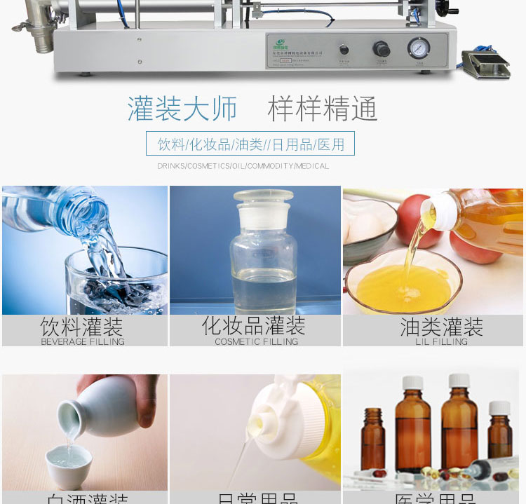 注:本機(jī)可選擇定做灌裝容量,可灌裝0.05-5L,適用于白酒、潤滑油、洗發(fā)水、沐浴露、洗手液等不含顆粒狀的液體物料。該機(jī)主要動力為氣源,客戶需自備空壓機(jī)設(shè)備