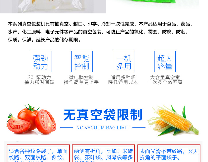 電腦版真空包裝機(jī)系列具有抽真空、封口、印字、冷卻一次性完成,本產(chǎn)品適用于食品,藥品,水產(chǎn),化工原料,電子元件等產(chǎn)品的真空包裝,可防止產(chǎn)品的氧化,霉變,防腐,防潮,保質(zhì),保鮮,延長(zhǎng)產(chǎn)品的儲(chǔ)存期限。