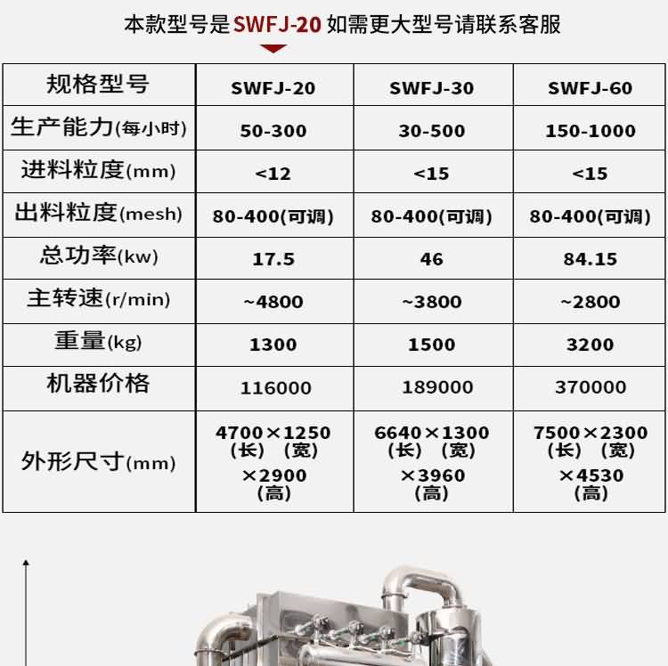 SWFJ超微粉碎機組,主要適合于粉碎細度在80-400目、產量較大的粉碎需求,非常適合藥廠、食品廠、化工廠的高精度粉碎要求,粉碎細度可隨意調節。