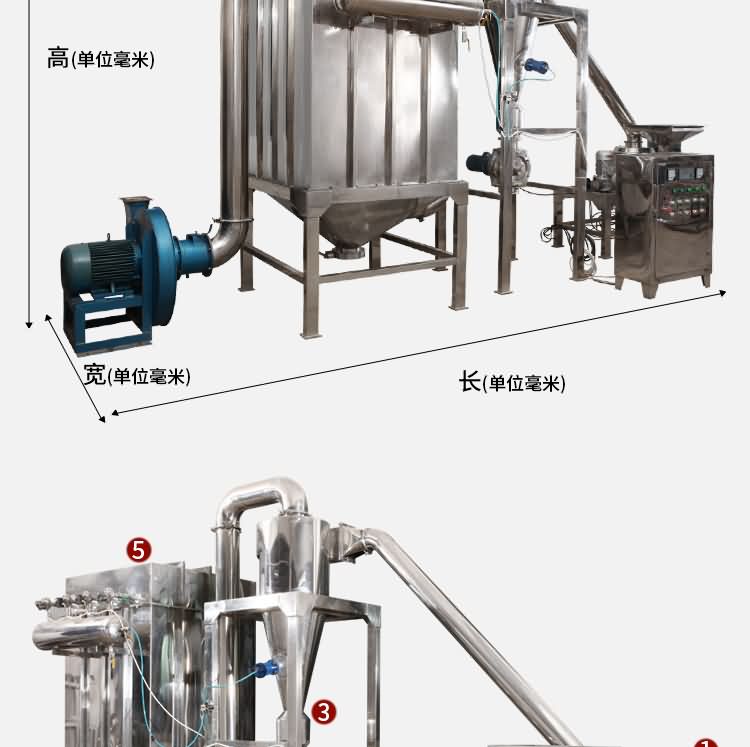 各型號超微粉碎機組都含主機、可調速的螺旋送料器、旋風收集器加氣錘震蕩裝置、袋式除塵箱加氣流脈沖裝置、引風電機造成負壓。大功率引風電機不但可使輸送管道形成負壓,使達到要求的細粉自動被風力吸入管道,而且巨大的風量還帶走了粉碎腔內不斷產生的熱量,同時對粉碎機組的管道起到一個強有力的清理效果。旋風收集器出料口加裝了關風機,出粉口無粉塵飛揚,達到了清潔、環保、節約的效果。