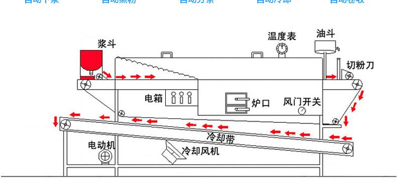 ◆全自動化:具有自動下漿、蒸粉、分條、冷卻和(收粉)功能;