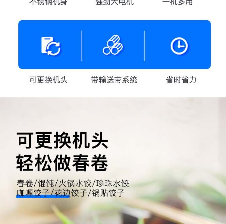 ?一機多用:只要更換模具,就可以制造不同的食品,如春卷、餛飩等,面皮厚度與餡量可調整;