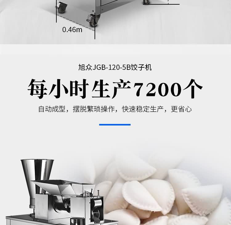 JGB-120-5B型餃子機是一款可生產各種肉餡、肉菜混合餡、全菜餡及其它種餡餃子的設備。完美的設計,兼顧衛生與美觀兩大優點,并且拆裝容易,清洗簡便。
