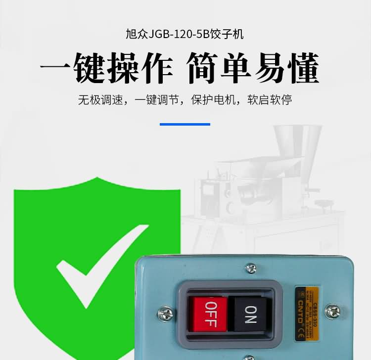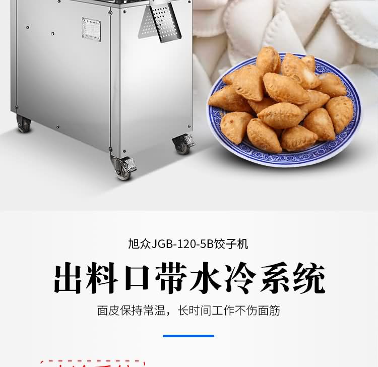 JGB-120-5B型餃子機,本機是一款可生產各種肉餡、肉菜混合餡、全菜餡及其他種餡餃子的設備。一機多用途,只要更換模具,就可制作不同的食品,如春卷、餛飩、咖喱角、鍋貼等。適用于賓館、飯店、餐廳、團體食堂加工,幼兒園、速凍餃子生產。