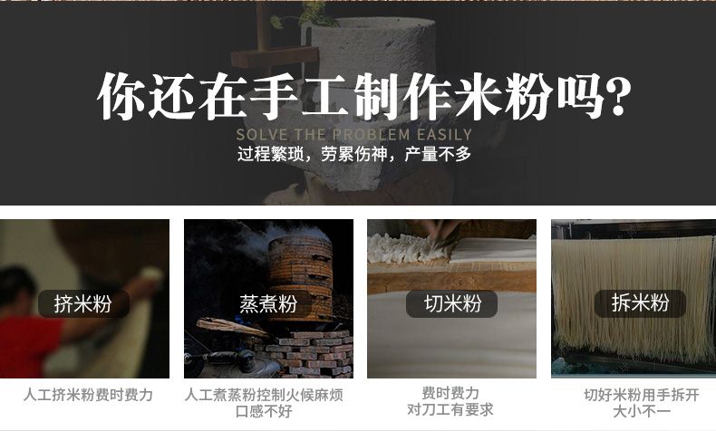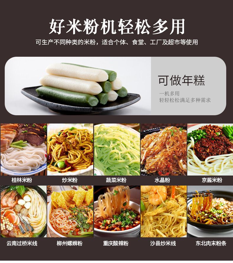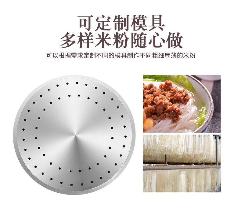改進型米粉、米線專用機,裝有自動溫空裝置,整個生產過程設備均在恒溫狀態下運行,自動化程度高,操作簡單,l人即可生產。可生產米粉、米線、桂林米粉、過橋米線、年糕等產品。各種形狀都可生產(圓、扁),加工食品外表光滑,厚薄、寬窄、粗細均勻可調,筋軟適度,有彈性,口感柔軟、味道純正。