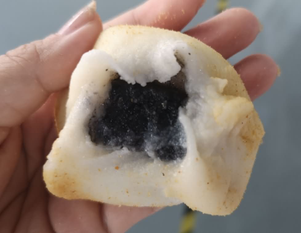 這是最開始的芝麻白糖餡,可以看到出來一點流動性都沒有,如果要用機器包的話需要稍微加工下才行