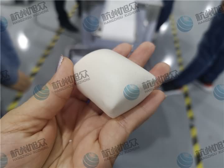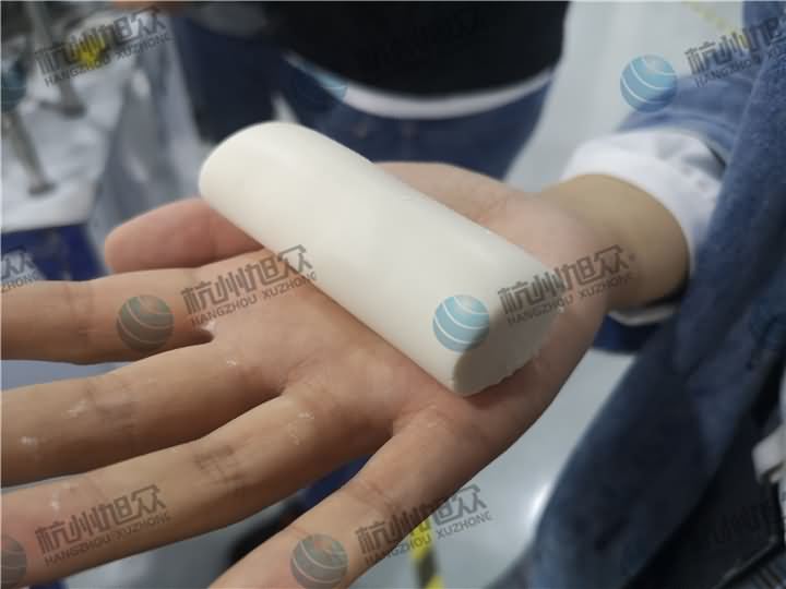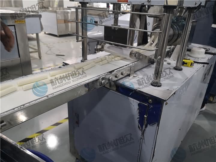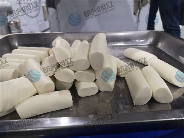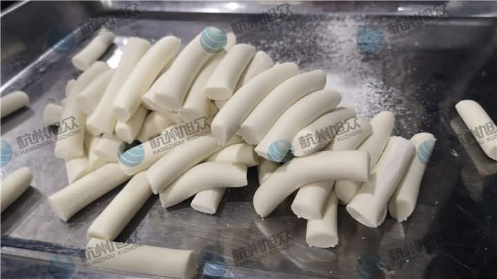 做芋圓啦!不過今天的客戶從山東不遠千里來到杭州旭眾,因為他們自己有在做芋圓,有著自己獨有的芋圓工藝技術,所以前期的工作都是他們的人員加工揉面成團,再通過芋圓機切割成他們想要的規格,由剛開始出兩孔的小芋圓變成單孔的大芋圓,也不知道他們的原料是什么,聞起來有一股奶糖的味道很香,那我們來看看芋圓機做出來的芋圓效果: