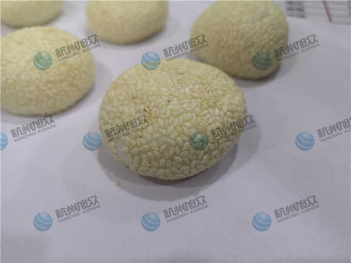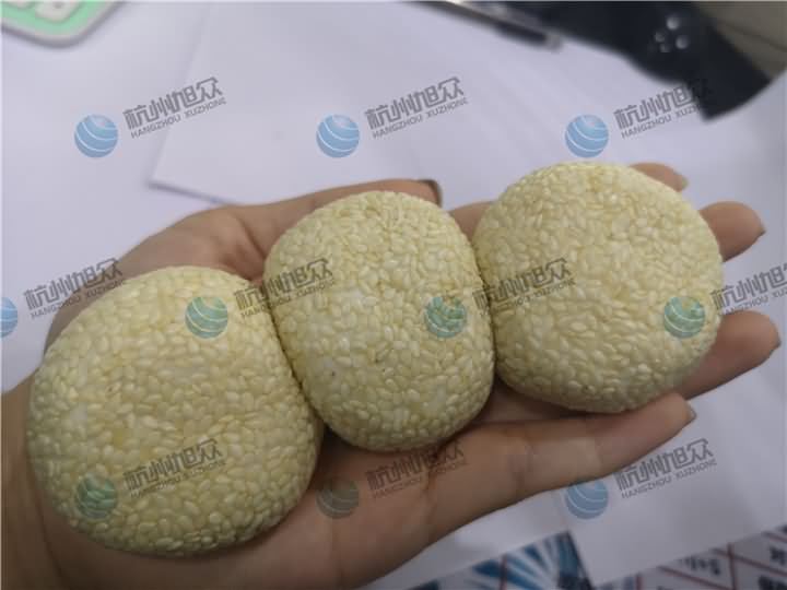 包餡機做出來的麻球就是這么一個光溜溜的麻球,克重大概48g左右,皮在46g,芝麻餡占非常小的比例,然后客戶還要裹白芝麻外衣,不可裹粉機目前沒有樣機,試不了于是采用了人工去給它們裹上白芝麻的效果如下圖: