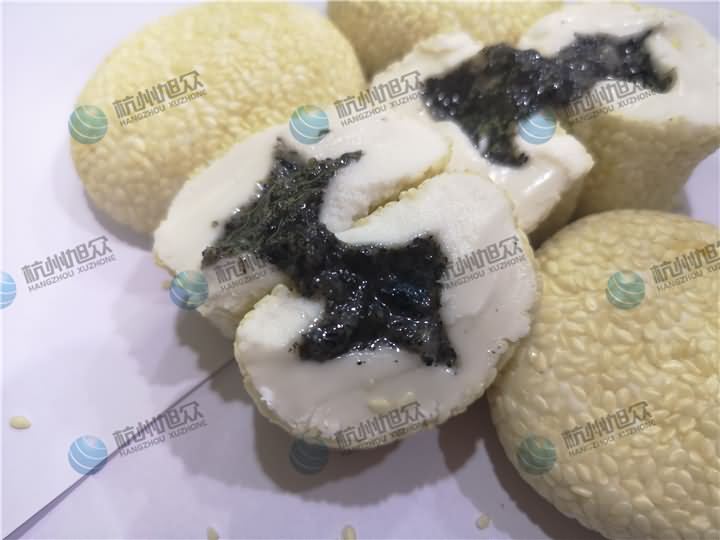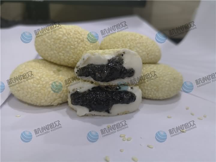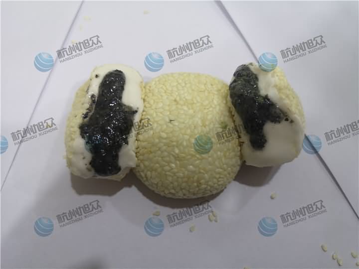 那么旭眾的麻球機究竟是怎樣的呢?那就是我們的多功能包餡機!昨日客戶將在自己食品廠和好的面團、袋裝的黑芝麻餡料及裹在外層的白芝麻帶來了現場,因為他們目前還是人工包芝麻成型,在人工投入方面非常的大,但是還是缺人,可以想象他們每日的生產量是有多大,于是他們帶著直接做好物料來到了現場,只要能看到包餡機做出他們想要的效果便可,那么來看看XZ-99多功能包餡機做出來的麻球是怎樣的: