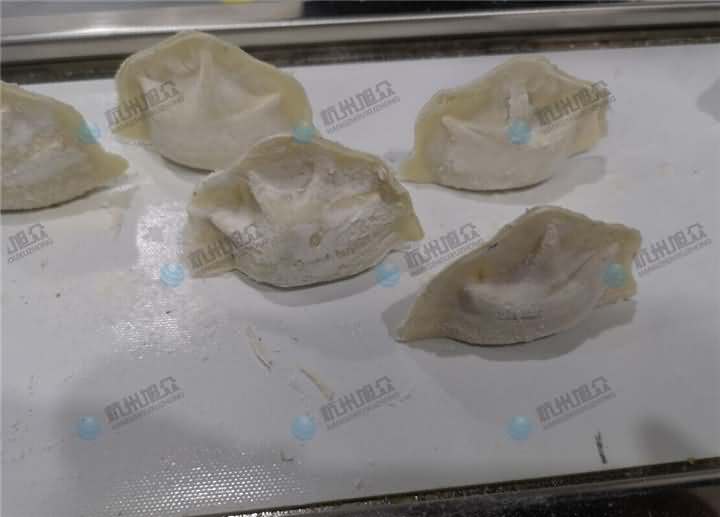 2、將壓好的面皮,鋪在餃子機的輸送架上,再人工將餃子機再次壓成面皮放入對應模具中便可,后續再調整面皮、餡料克重之后,便可自動成型餃子