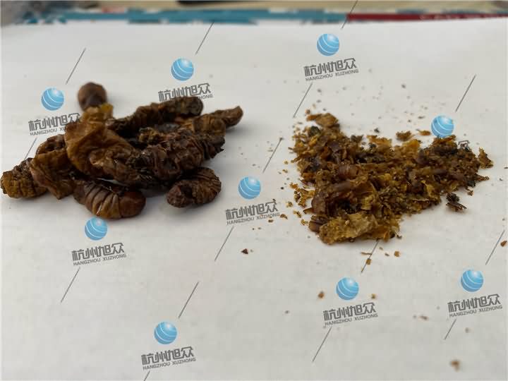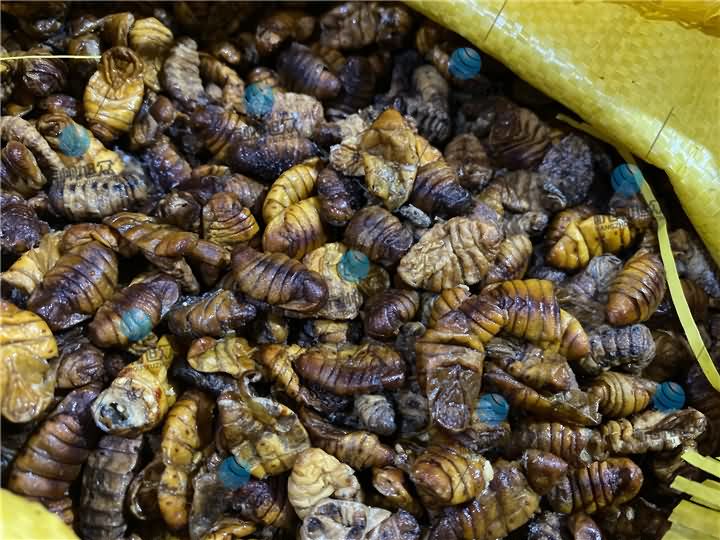 蠶蛹烘干前體內油脂甚多,有些肥碩點一捏就出汁: