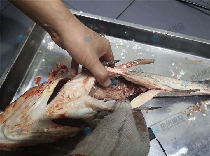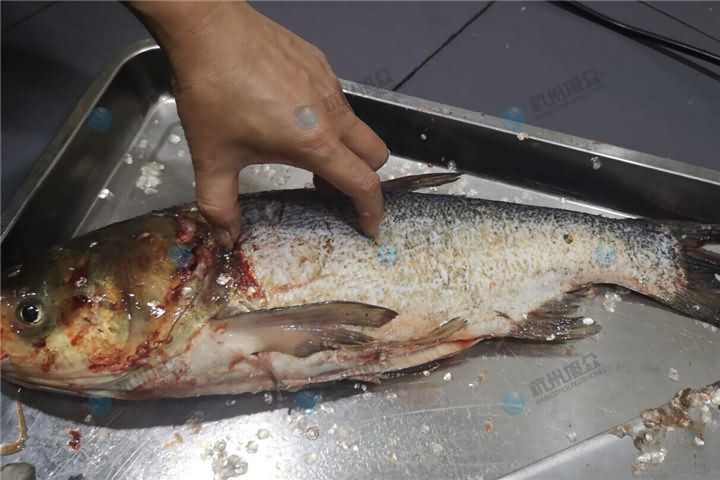 殺魚機去鱗效果非常明顯,白鰱身上的魚鱗去的很干凈,當然也并不說百分百能去干凈,畢竟殺魚機沒有思想,偶爾也不能將魚鰭下方的死角去鱗到,至于開肚刀深淺也是根據魚種類來調節的,白鰱和黑魚就是兩種不同體型的魚,那么開肚的那個刀殺白鰱的時候要稍微淺一點,太深的話就會容易刺破魚膽。當然至于如何調節殺魚機可電話4008852117咨詢客服!