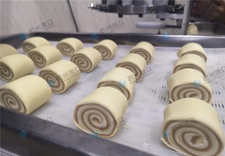 3、將擺放好的面皮放置XZ-290AS卷面式包子機輸送架上,開啟開關(guān),自動整形壓面卷面切割成方饅頭