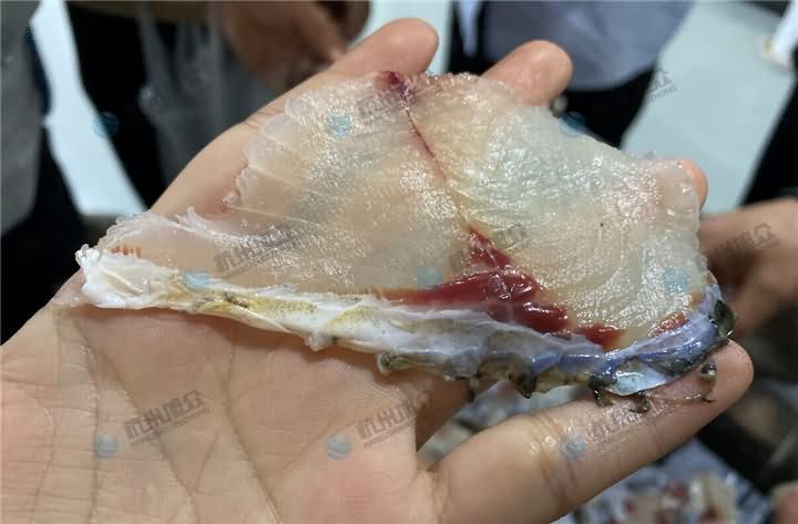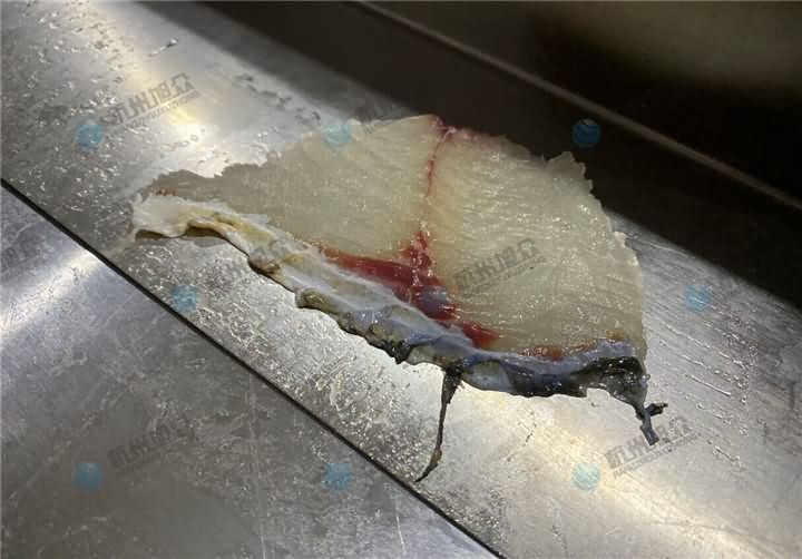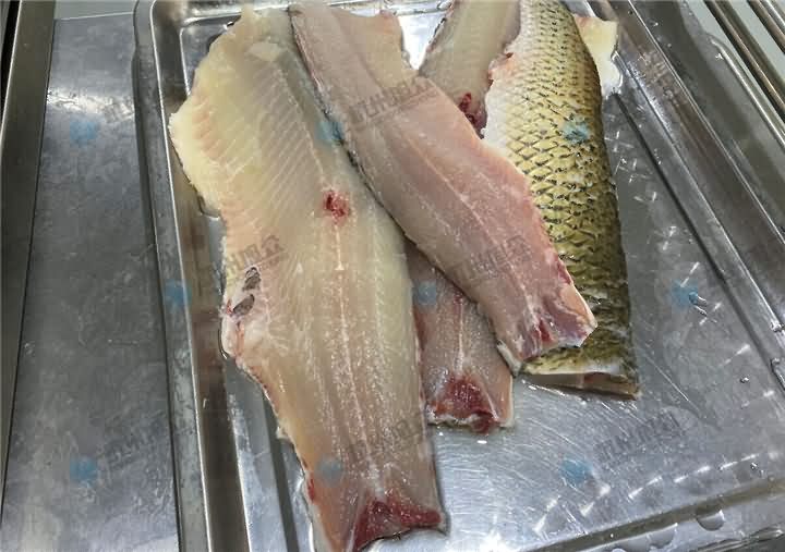 全自動(dòng)切魚片機(jī)現(xiàn)場演示切草魚片,在切草魚片之前要做的工序,先去鱗開肚去內(nèi)臟去魚頭后,再將魚大骨去掉,不去的話刀片容易損壞,所以要將魚大骨剃掉后再用魚片機(jī)30°斜度切成2.3mm魚片: