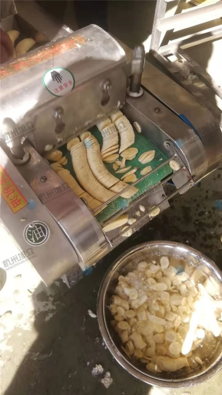 人工去皮后,再用切菜機(jī)快速切成片狀