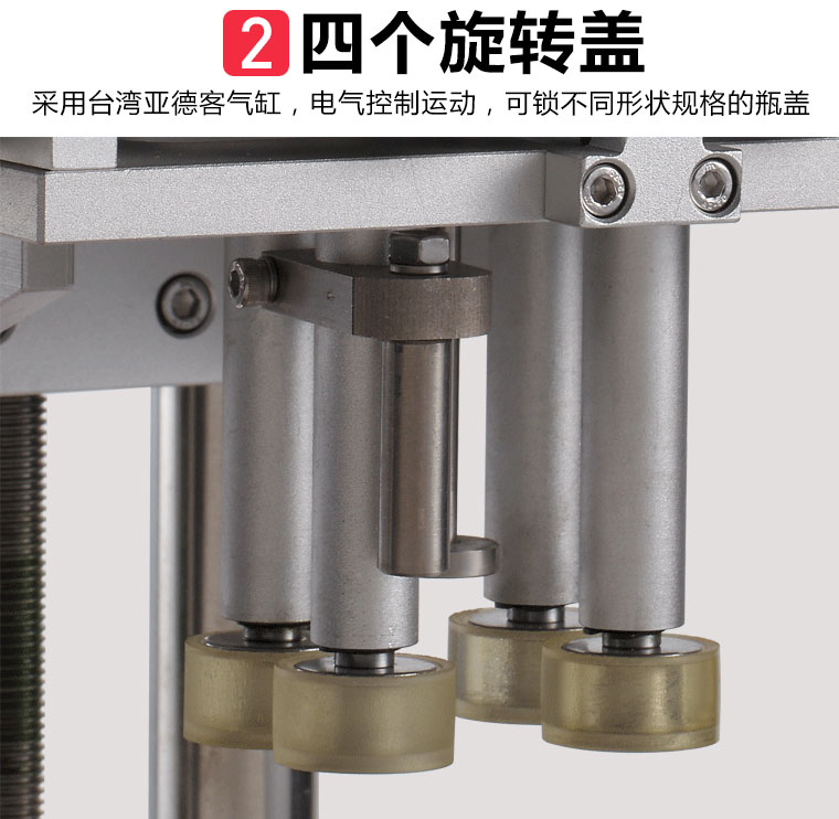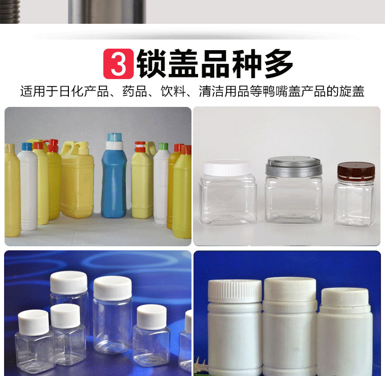 旋蓋機(jī)電氣控制運(yùn)動(dòng),穩(wěn)定性強(qiáng);設(shè)有定位裝置,旋蓋標(biāo)準(zhǔn),操作方便;鎖蓋范圍寬,可鎖不同形狀規(guī)格的瓶蓋;完善了噴頭、泵頭、噴霧泵、手扣式噴槍旋蓋難的問題;鎖蓋轉(zhuǎn)速可調(diào),可根據(jù)不同瓶蓋調(diào)節(jié)松緊度。自動(dòng)鎖蓋機(jī)的的適用用于各種日化、醫(yī)藥、化工行業(yè)的噴頭/泵頭/噴霧泵/手扣式噴槍的瓶蓋鎖蓋機(jī)械。