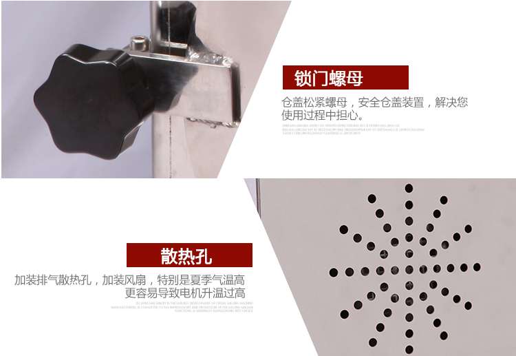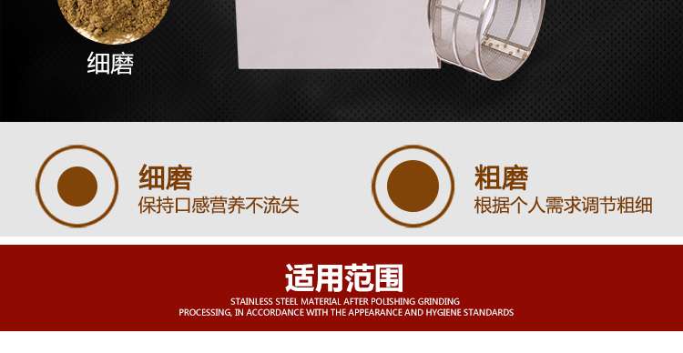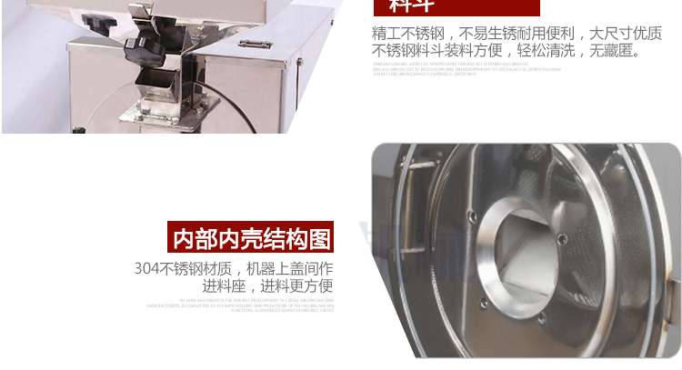 1、機器外殼與粉碎槽均為S304不銹鋼材質經過拋光研磨處理,符合美觀與衛生標準。適合食品廠、加工店、商場、超市、藥店、診所、學校、研究所、家庭等單位使用。