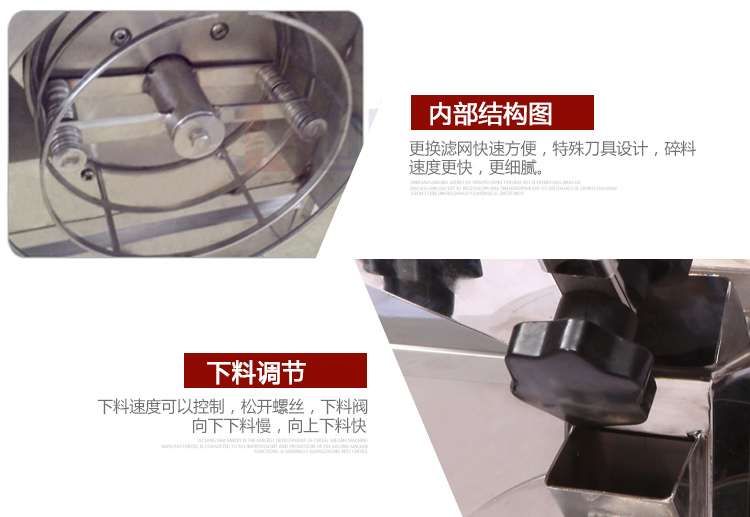 6、特殊刀具設計,使用料速度加快。粉碎含油量很高的物料,用粗篩網。反之,粉碎含油量低或者不含油的物料,可以用細的篩網。