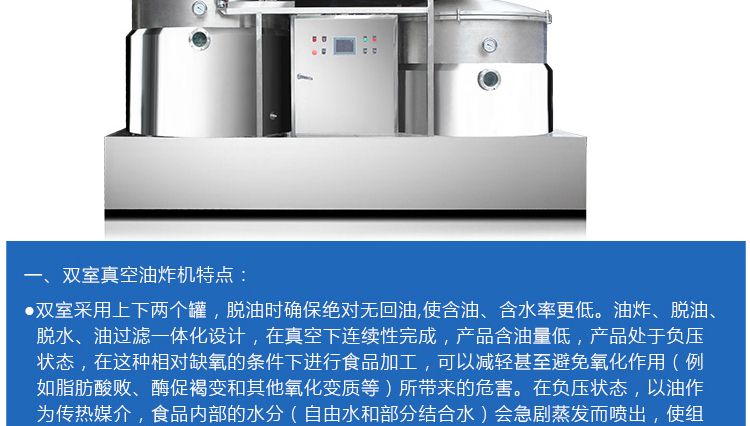 ●雙室采用上下兩個罐,脫油時確保無回油,使含油、含水率低。油炸、脫油、脫水、油過濾一體化設計,在真空下連續性完成,產品含油量低,產品處于負壓狀態,在這種相對缺氧的條件下進行食品加工,可以減輕甚至避免氧化作用(例如脂肪酸敗、酶促褐變和其他氧化變質等)所帶來的危害。在負壓狀態,以油作為傳熱媒介,食品內部的水分(自由水和部分結合水)會急劇蒸發而噴出,使組織形成疏松多孔的結構。