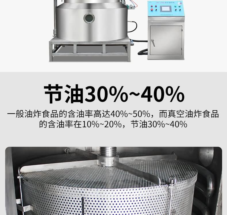 ●低溫真空油炸可以防止食用油脂劣化變質,不必加入其他抗氧化劑,可以提高油的反復利用率,降低成本。一般油炸食品的含油率高達40%~50%,而真空油炸食品的含油率在10%-20%,節油30%-40%,節油效果顯著。食品脆而不膩,可貯性能良好。