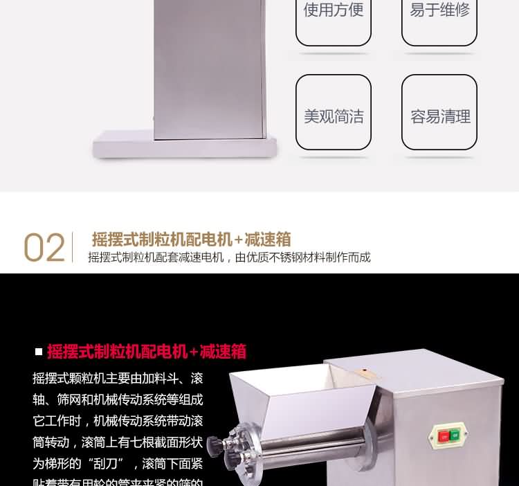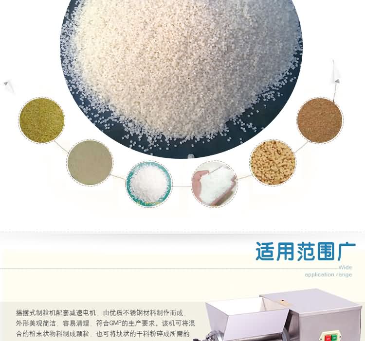 搖擺式顆粒機(jī)可將混合的粉末狀物制成顆粒,也可將塊狀的干料粉碎成所需的顆粒。搖擺式顆粒機(jī)適用于制藥廠、化工廠、食品廠、科研單位、實(shí)驗(yàn)室、醫(yī)院、保健品廠批量生產(chǎn)。搖擺式顆粒機(jī)整機(jī)全部采用優(yōu)質(zhì)不銹鋼制造,符合GMP標(biāo)準(zhǔn)。